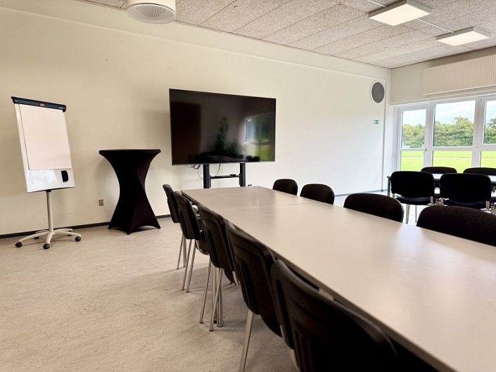 Mødelokalet er udstyret med en stor TV-skærm, som nemt kan tilsluttes din egen PC – perfekt til præsentationer og møder med visuelle oplæg.